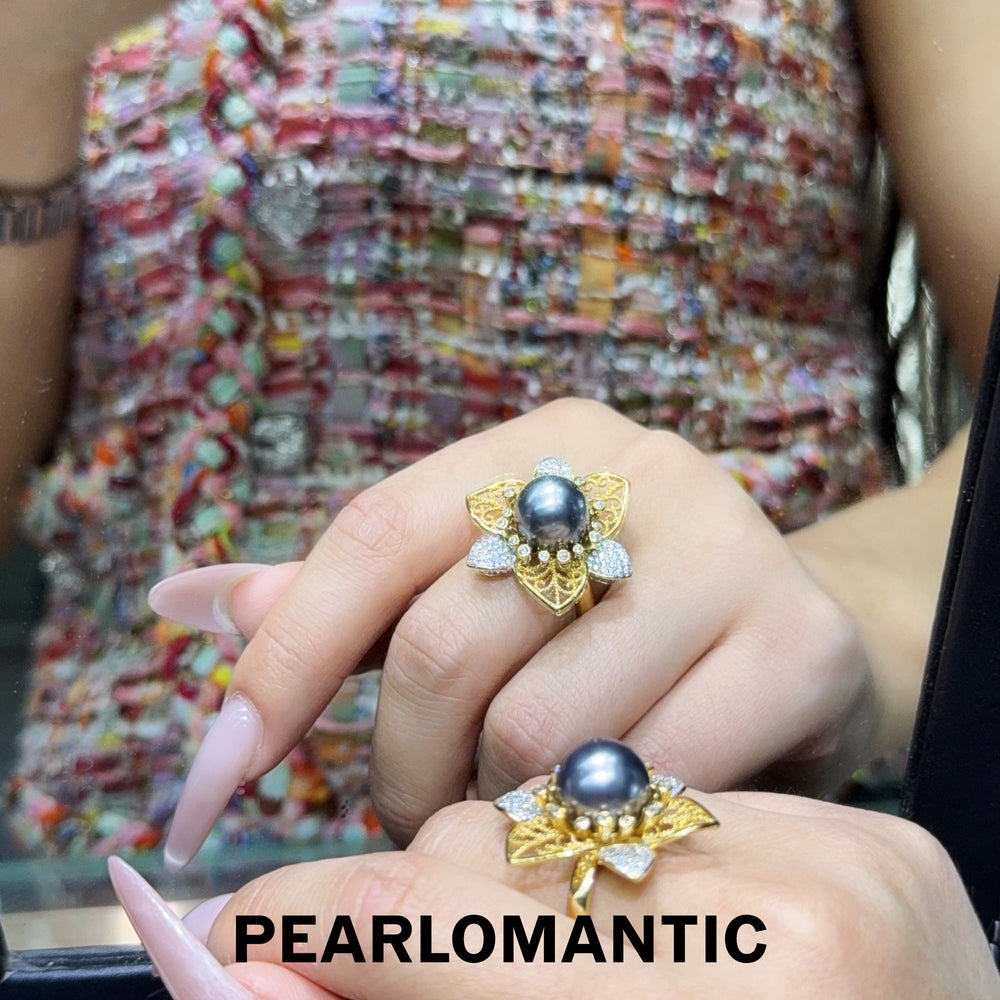 [Everyday Essentials] Midnight Bloom – Tahitian Black Pearl Floral Adjustable Ring