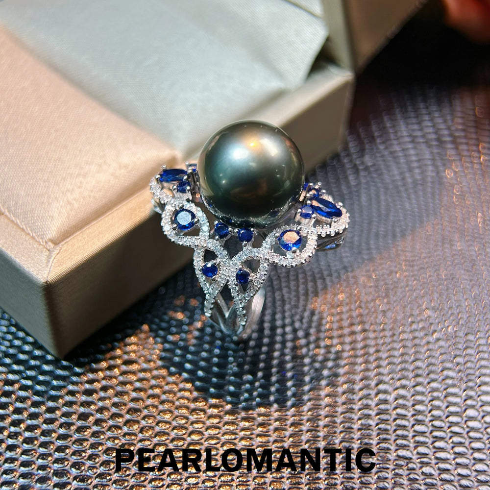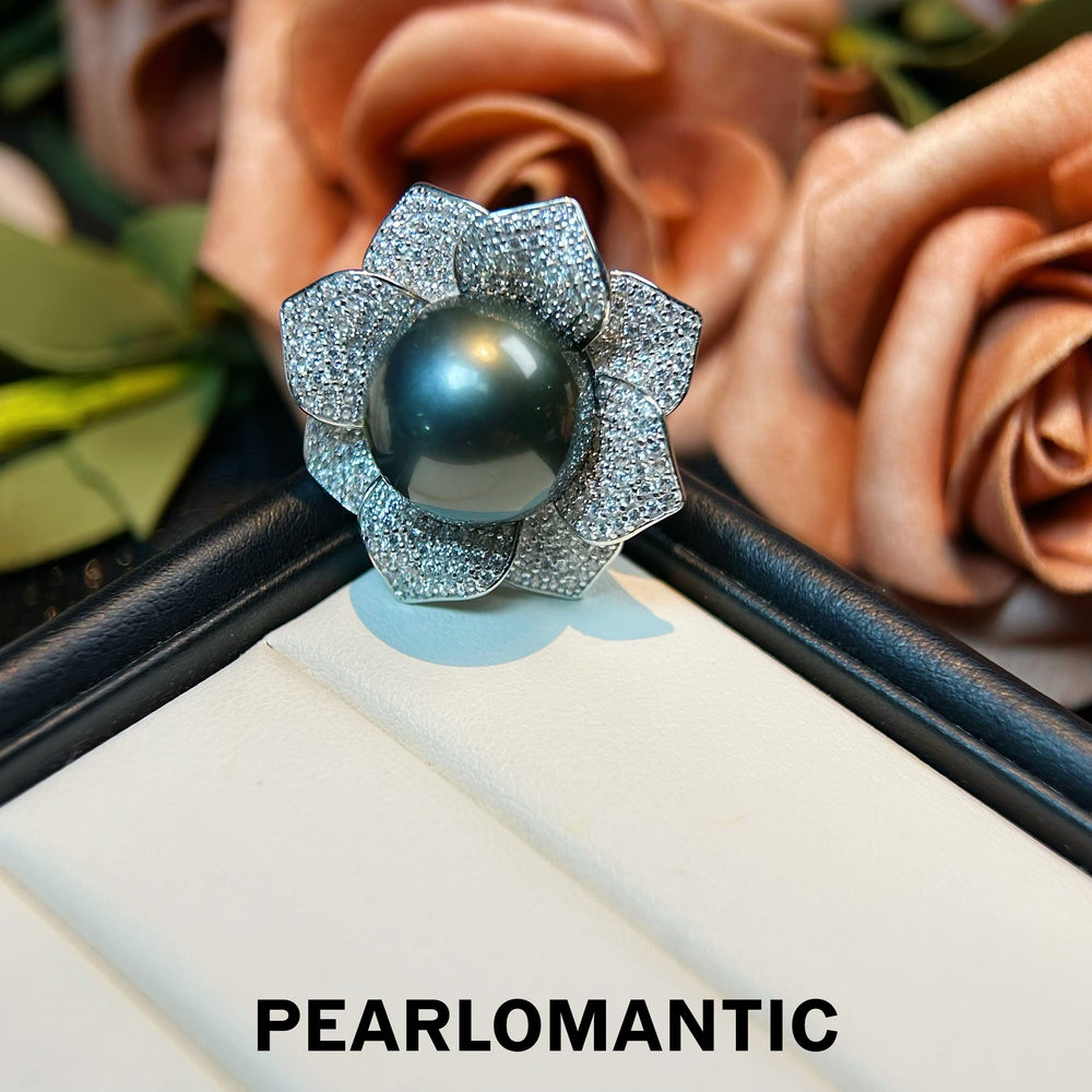 [Designer's Choice] Tahitian Black Pearl Floral Sparkle 12.5mm Adjustable Silver Ring
