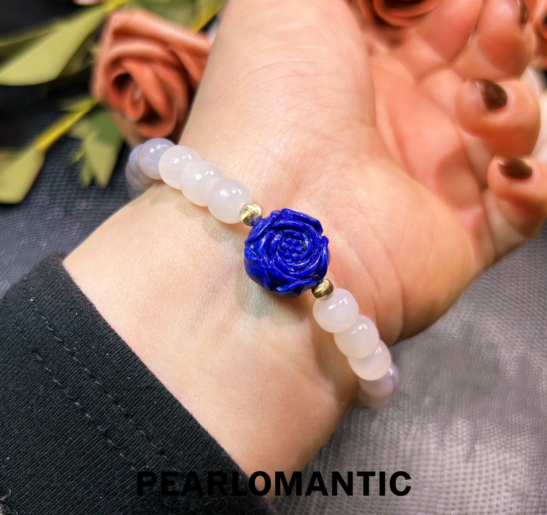 Main Stone: Hand-Carved Natural Lapis Lazuli Peony Flower and Premium Nephrite Jade.